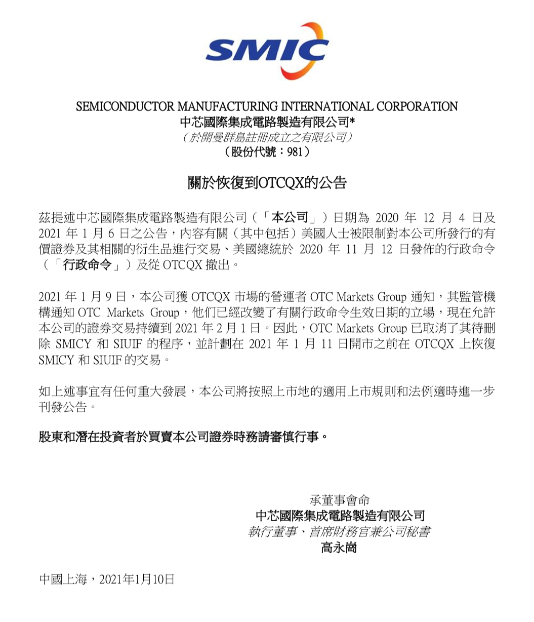 公告顯示,中芯國際 1 月 29 日獲得 otcqx 市場營運者美國場外交易集團(otc markets group)通知,公司的美國存託憑證(adr)於今年 2 月 1 日美國東部時間. 中芯國際在今年 2 月表示,2021 年的收入目標是「中至高個位數百分比增長」,ng 認為,中芯國際目前屬於高標範圍。 中芯國際在去年 12 月被美國商務部列入貿易黑名單,原因是中芯國際與中國軍工集團重要實體間存在活動的證據,此舉被視為可能損害中芯國際製造最先進晶片目標的能力。 【新唐人北京時間2021年07月05日訊】 中芯國際 7月4日晚公告稱,原技術研發副總裁 吳金剛 博士近日因個人原因辭職。. 作者 moneydj | 發布日期 2021 年 02 月 01 日 12:10 | 分類 國際貿易 , 國際金融 , 金融政策. 中芯國際集成電路製造有限公司(簡稱中芯國際,港交所:981, 滬市:688981, nyse 除牌前:smi)於2000年4月在開曼群島註冊成立,總部位於中國 上海,為中國大陸規模最大的集成電路 晶圓代工企業。 截至2020年6月1日,中芯國際向全球客戶提供0.35微米到14納米多種技術節點、不同工藝平台的集成電路.